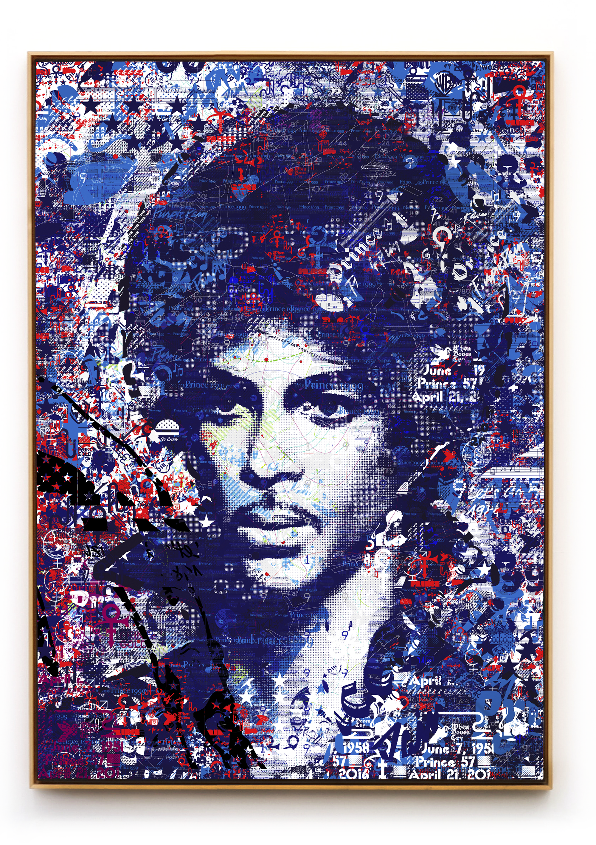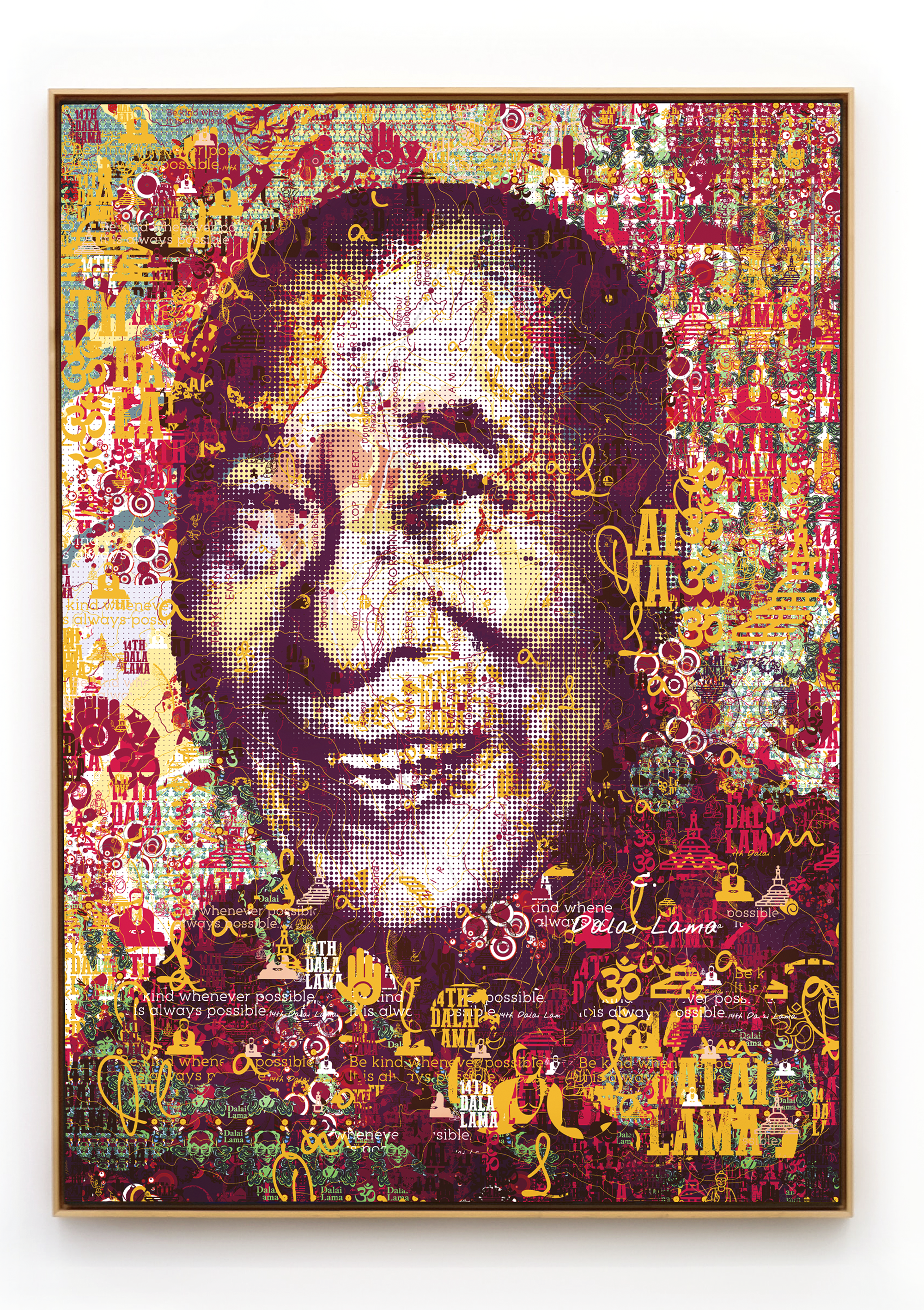 The works are created by building up layers of symbols and paths—elements of maps—into larger-than-life portraits of our modern icons. Despite their elevation to greatness, their journeys and those of the lives they affected are wholly interdependent. The process of the artist in “mapping” a face symbolizes a collaboration between his subjects and the world at large: the image ceases to represent alone personality and instead becomes a shared experience.